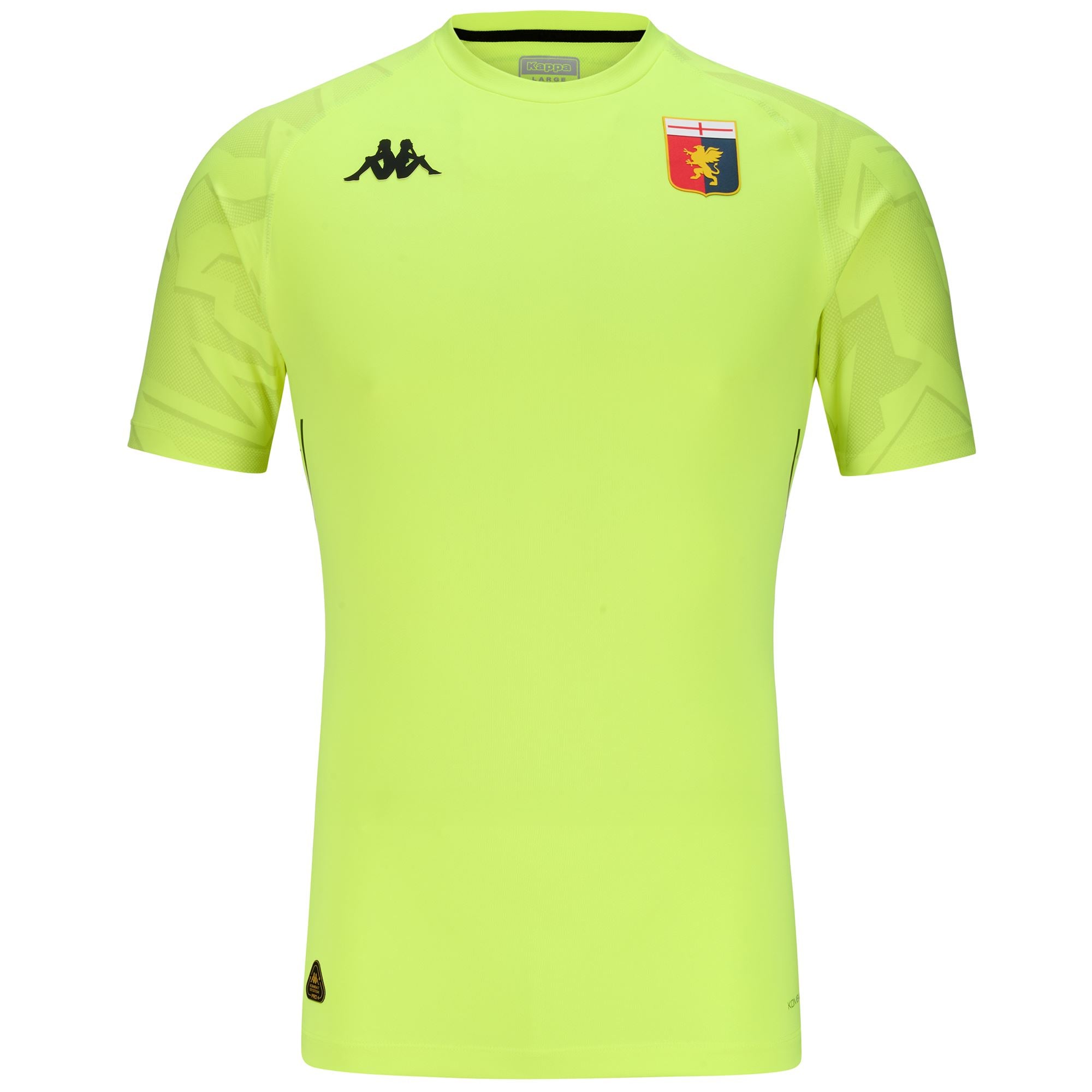 GARA. Camiseta de juego KOMBAT™ PRO GOALKEEPER 2025 para hombre en tejido elástico reciclado y con tecnología HYDRO-WAY PROTECTION. AJUSTE CEÑIDO. Manga corta, cuello redondo, gráfico en relieve en la parte delantera, en la parte trasera y en las mangas, gráfico impreso en las mangas. Logo Omini en el pecho en impresión HD y banda Omini en los lados aplicada con transferencia térmica, logo del equipo en silicona aplicado en el pecho. GENOA CFC.