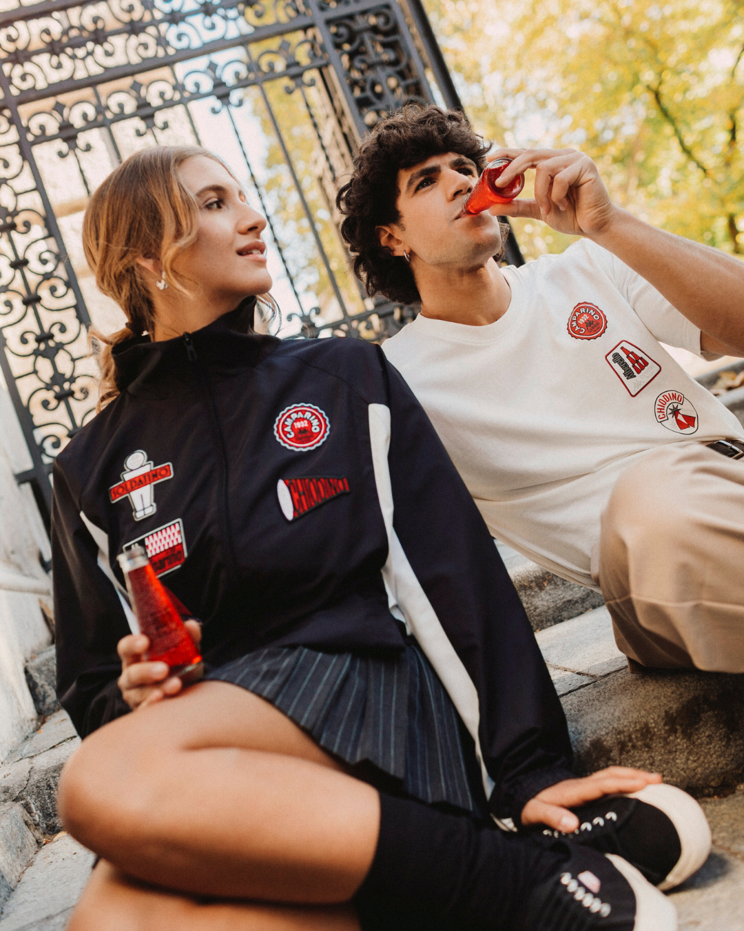 Sudadera tejida para hombre con inserciones laterales en color de contraste, cuerpo forrado en malla y acabados elásticos. Los gráficos estampados y los parches aplicados celebran la colaboración con el icónico aperitivo italiano Campari Soda. OVERSIZE FIT.