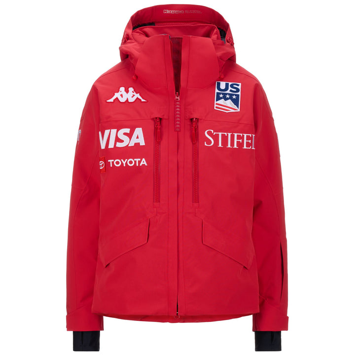 GARA. Chaqueta acolchada para mujer en tejido de stretch mecánico con PROTECCIÓN CONTRA AGUA, PROTECCIÓN CLIMÁTICA, PROTECCIÓN IMPERMEABLE 20000 mm, TRANSPIRABILIDAD 20000gr/m2/24, acolchado Thermolite® 180gr, TECNOLOGÍA KAPPA SKI SYSTEM ™. AJUSTE REGULAR. Capucha desmontable, bolsillos con cremallera impermeables, refuerzo en los hombros, cremallera de ventilación, polaina interna, puños con polainas de tela elástica, costuras termoselladas, ajustes de regulación. Logotipo Omini bordado y personalizaciones del equipo. US SKI AND SNOWBOARD.