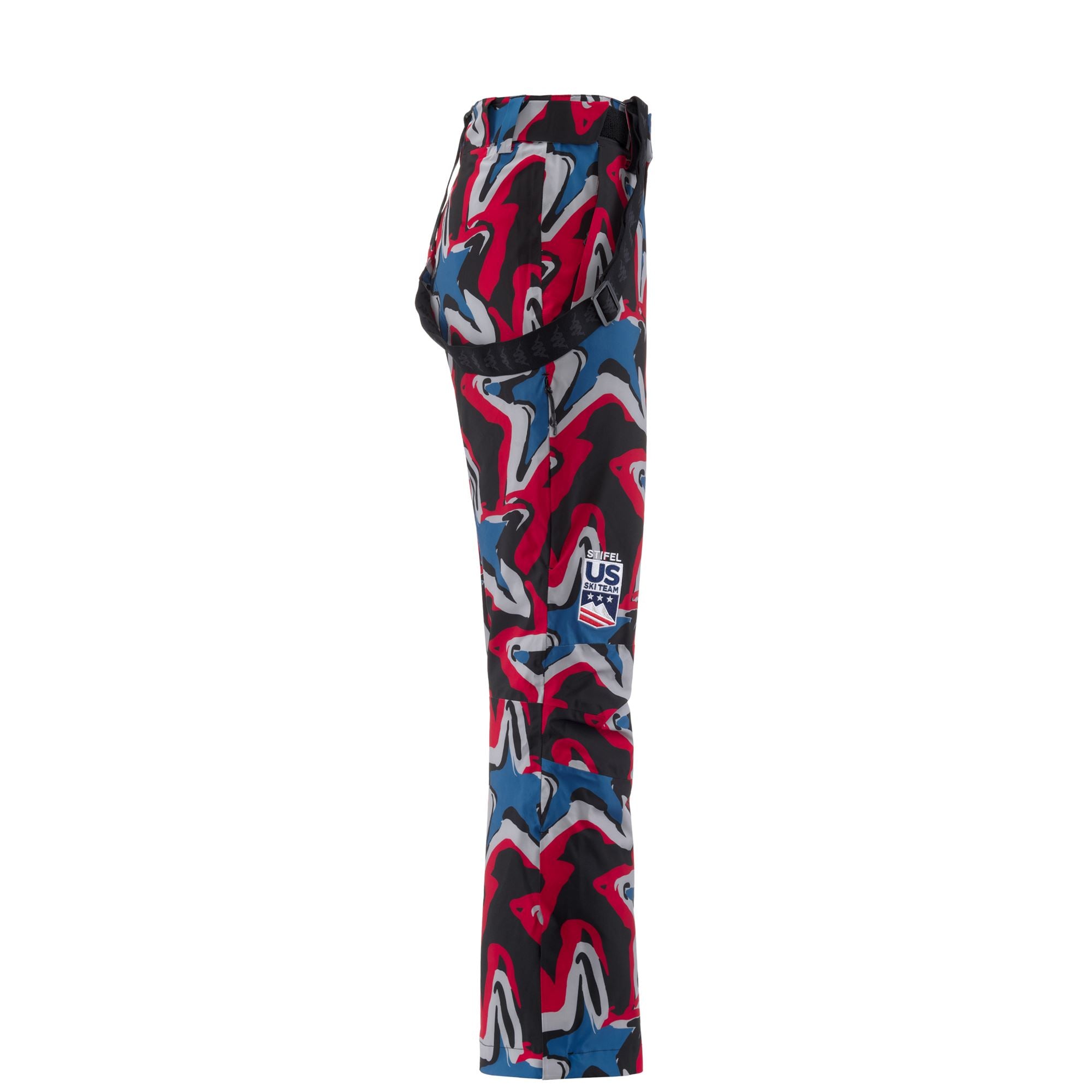 Pantalones de nieve para hombres con aislamiento de 60 g, fabricados con un tejido elástico de 2 capas. Impermeables, repelentes al agua y transpirables. Cuenta con tirantes removibles con el logo Omini repetido, cintura ajustable, bolsillos con cremallera impermeables, bajo reforzado, aberturas con cremallera en la parte inferior, cremalleras de ventilación, polainas para botas y costuras selladas. Logo Omini aplicado y personalizaciones del equipo de esquí y snowboard de EE. UU.