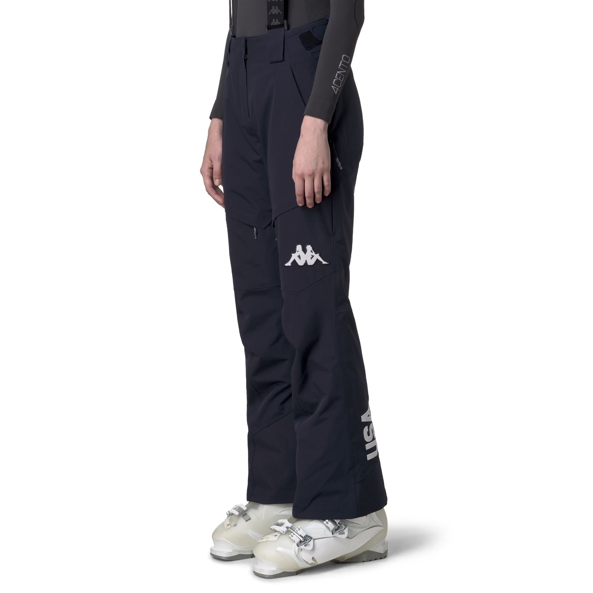 El corte regular está diseñado para adaptarse perfectamente a la forma del cuerpo. Otras características técnicas incluyen aberturas para las piernas impermeable con cremallera, cintura ajustable, bolsillos con cremallera y solapa, perneras inferiores reforzadas, polainas interiores para las botas y costuras selladas para una protección completa contra los elementos. Entre los detalles característicos, destacan el logotipo Omini y las personalizaciones de US Ski y Snowboard Team.