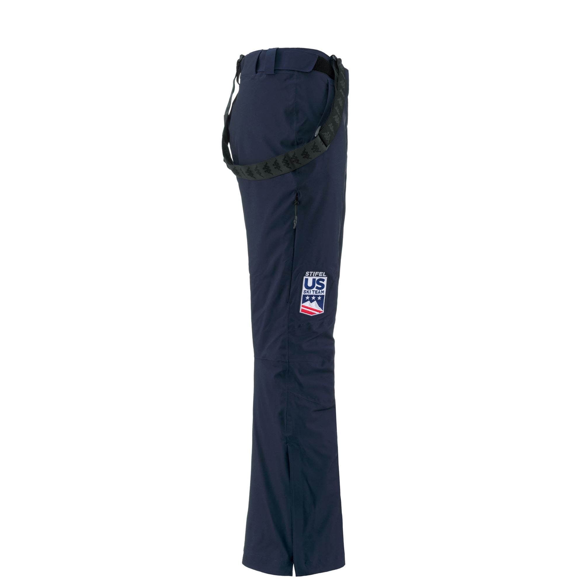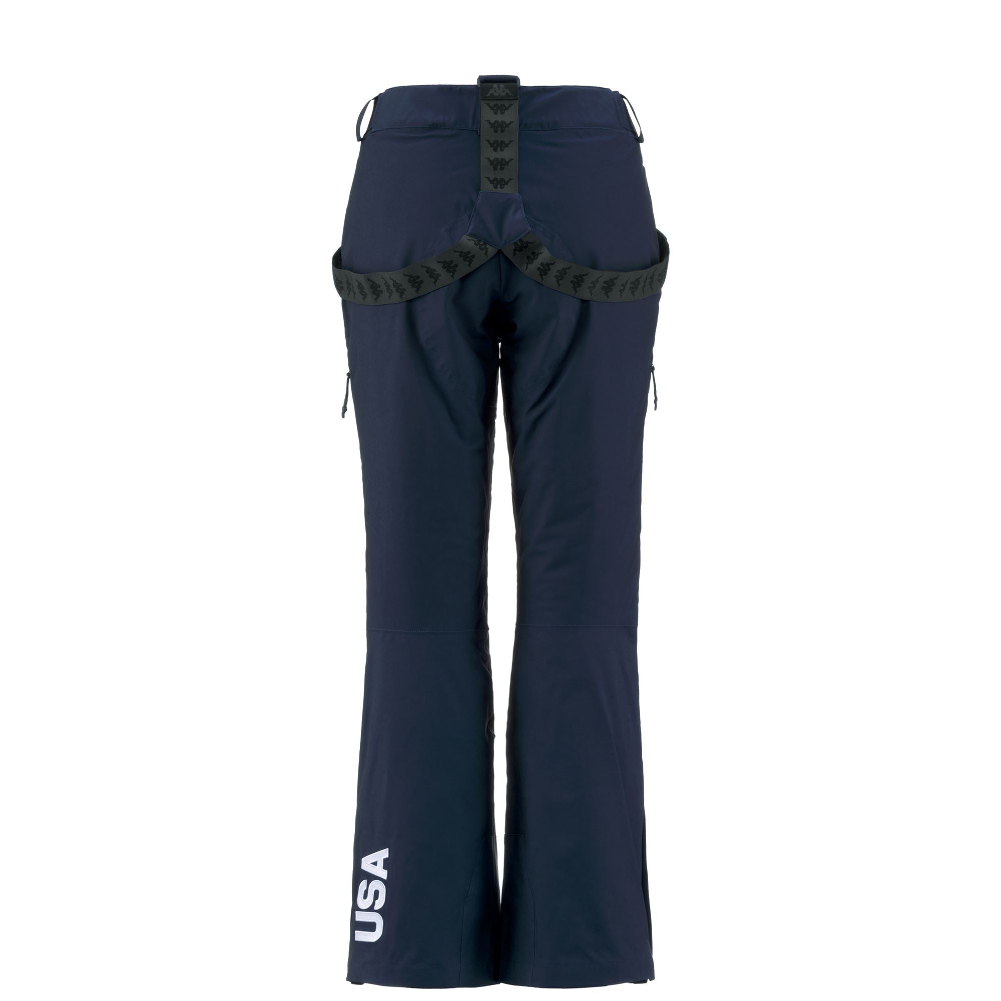 Pantalones de nieve para mujeres en tejido elástico de 2 capas con aislamiento de 60 g. Impermeables, repelentes al agua y transpirables. Cuenta con tirantes desmontables con el logo Omini repetido, ajuste en la cintura, bolsillos con cierre de cremallera impermeable, dobladillo inferior reforzado, aberturas con cremallera en el dobladillo inferior, polainas para botas y costuras selladas. Logo Omini aplicado y personalizaciones del equipo US SKI & SNOWBOARD.