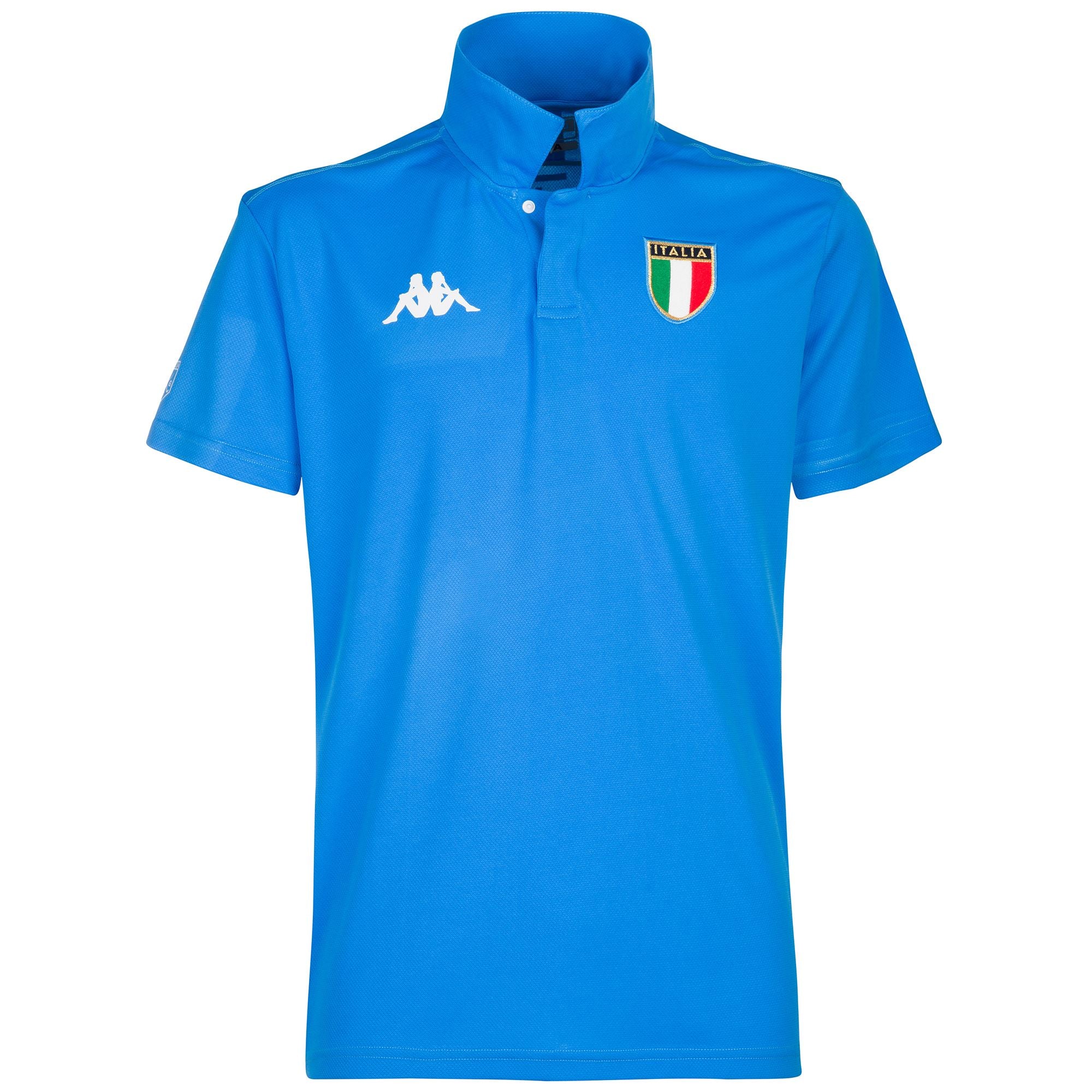 GARA. Polo tecnica da uomo in tessuto piquet con tecnologia HYDRO-WAY PROTECTION. REGULAR FIT. Maniche corte, colletto dello stesso tessuto e due snap nascosti sulla placca frontale. Logo Omini e stemma Italia in applicazione sul petto, logo FIG stampato sul fondo della manica destra, ITA lettering stampato e tape stampato con Kappa lettering sul retro, tape con Banda stampata sui lati. FEDERAZIONE ITALIANA GOLF.