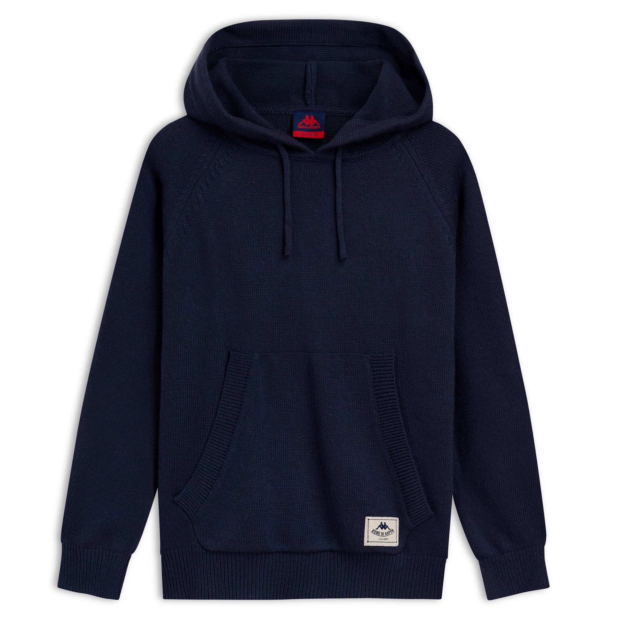 COLLEZIONE. Maglia da uomo con cappuccio. REGULAR FIT. Realizzato con filato misto lana in maglia rasata, tasca a canguro, bordi in costina. Etichetta jacquard con personalizzazione Robe di Kappa applicata sul davanti.