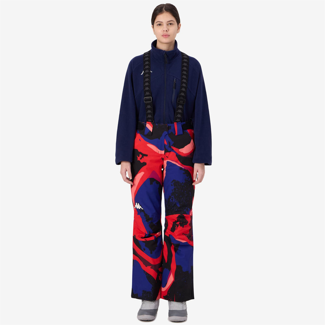 SPORT. Pantaloni donna imbottiti, in tessuto 2strati stretch con tecnologia WATERPROOF PROTECTION 10,000 mm H2O, BREATHABILITY 10,000 g/m²/24h, con trattamento idrorepellente PFC-Free, imbottitura 60gr. SLIM FIT. Bretelle staccabili personalizzate Banda con ripetizione del logo Omini, regolazione vita, tasche con chiusure zip impermeabili, rinforzi fondo gamba, apertura zip fondo gamba, ghette scarponi, cuciture termonastrate. Grafica all-over stampata. Logo 8CENTO applicato. Logo Omini applicato.