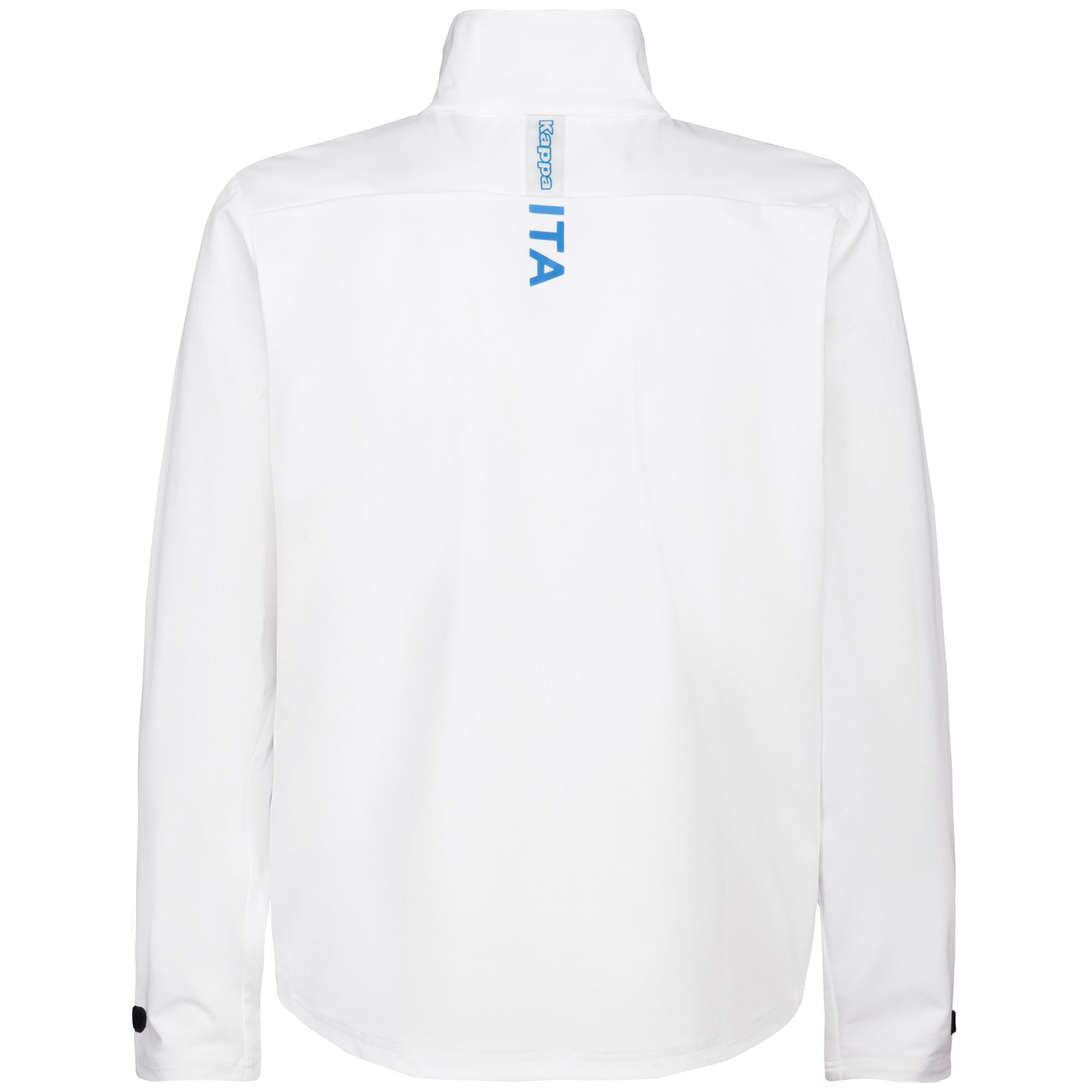GARA. Giacca softshell da uomo in interlock accoppiato e con tecnologia WATER & WIND PROTECTION. REGULAR FIT. Apertura frontale full zip, tasche frontali con zip, zip resistenti all'acqua, polsi regolabili con patta a strappo. Logo Omini e stemma Italia in applicazione sul petto, logo FIG stampato in basso sul polso destro, ITA lettering stampato e tape stampato con Kappa lettering sul retro, tape con Banda stampata sui lati. FEDERAZIONE ITALIANA GOLF.