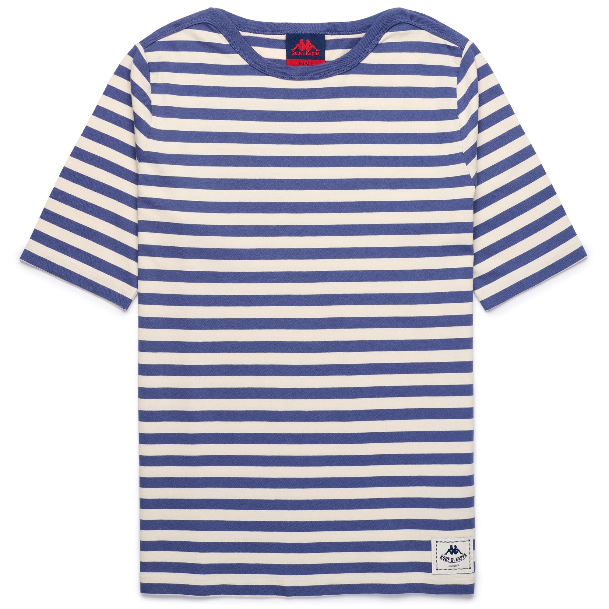 COLLEZIONE. T-shirt girocollo da donna rigata. REGULAR FIT. Manica corta, bordi in contrasto colore. Etichetta jaquard applicata con personalizzazione Robe di Kappa.