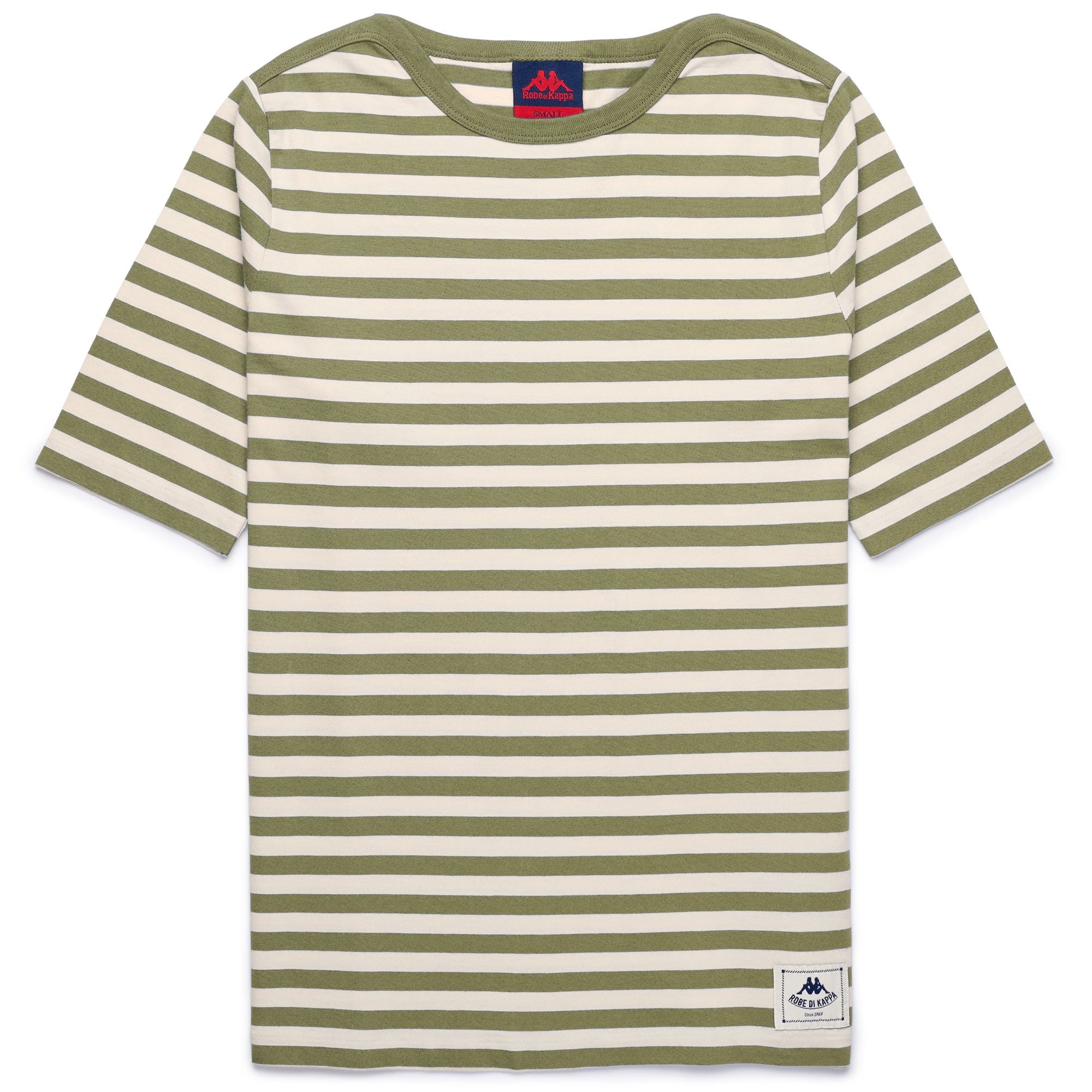 COLLEZIONE. T-shirt girocollo da donna rigata. REGULAR FIT. Manica corta, bordi in contrasto colore. Etichetta jaquard applicata con personalizzazione Robe di Kappa.