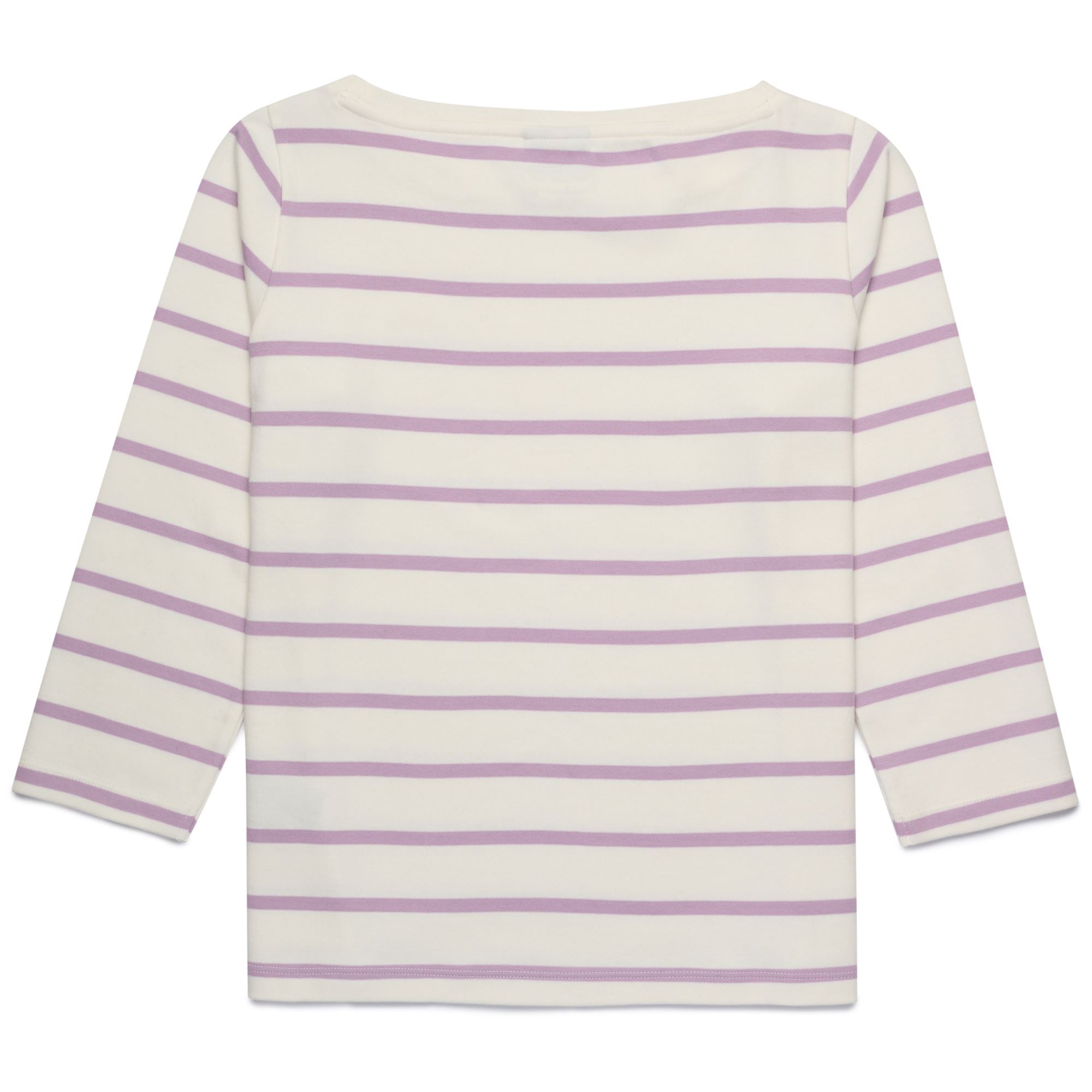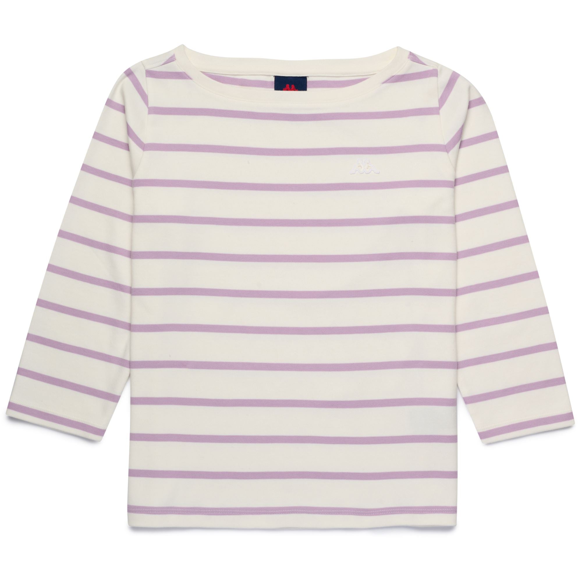 CLASSICO. T-shirt donna in interlock di cotone, rigato tinto filo. REGULAR FIT. Scollo a barchetta, manica 3/4. Logo omini sul petto.