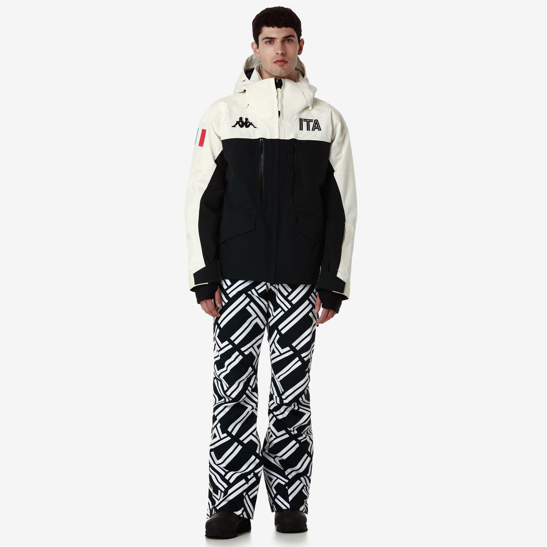SPORT. Man padded jacket in mechanical stretch fabric with WATER PROTECTION, CLIMA PROTECTION, WATERPROOF PROTECTION 20000 mm H2O, BREATHABILITY 20000gr/m2/24h, with water repellent treatment PFC-Free, padding Thermolite® 180gr, KAPPA SKI SYSTEM TECHNOLOGY ™. REGULAR FIT. Detachable hood, waterproof zip pockets, reinforced shoulder, ventilation zip, inner gaiter, cuff gaiters in stretch fabric, heat sealed seams, regulation adjustments. Embroidered Omini logo and Italy personalizations.