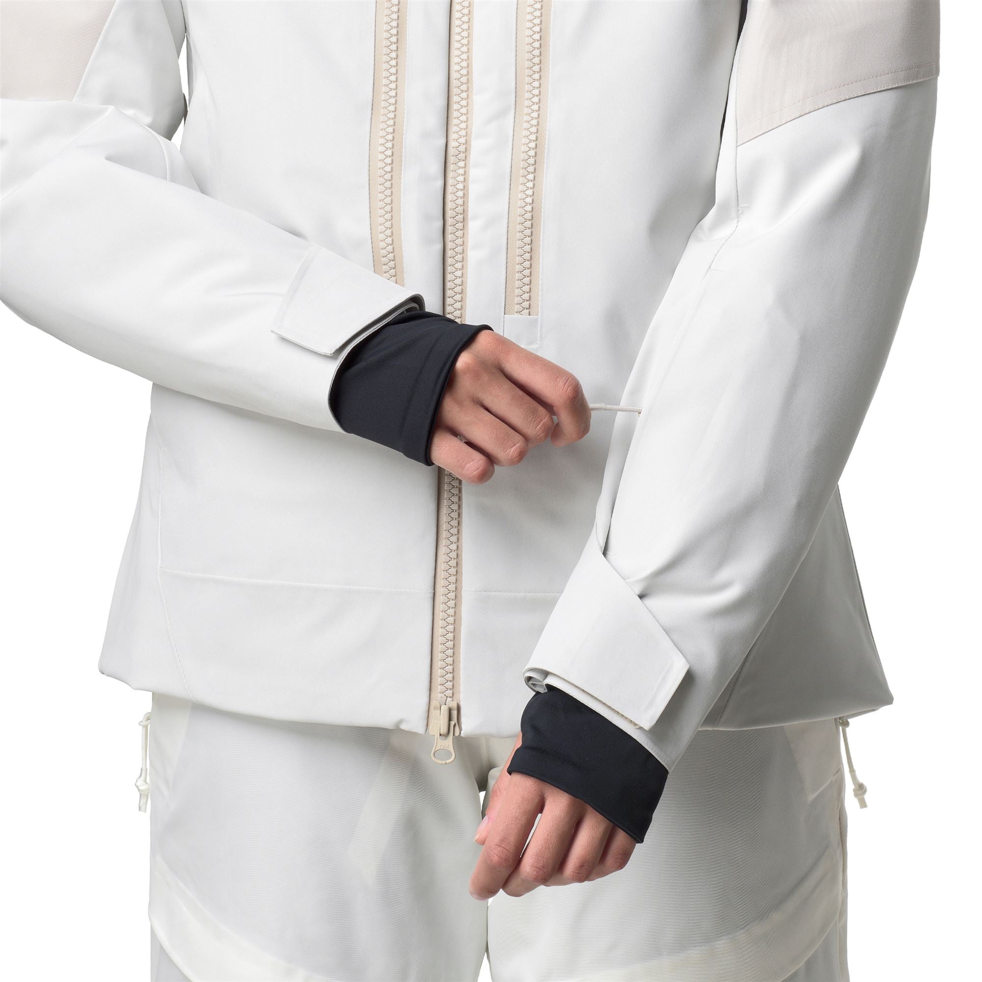 Regular fit offers a balanced and functional fit. The jacket features a detachable hood, flap pockets with zip closure, reinforced shoulders, ventilation zips, internal snow gaiter, elastic fabric cuffs, taped seams, and customizable adjustments.