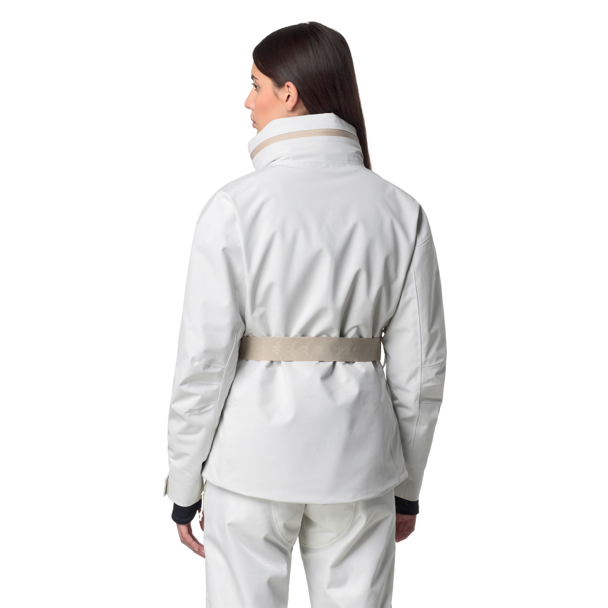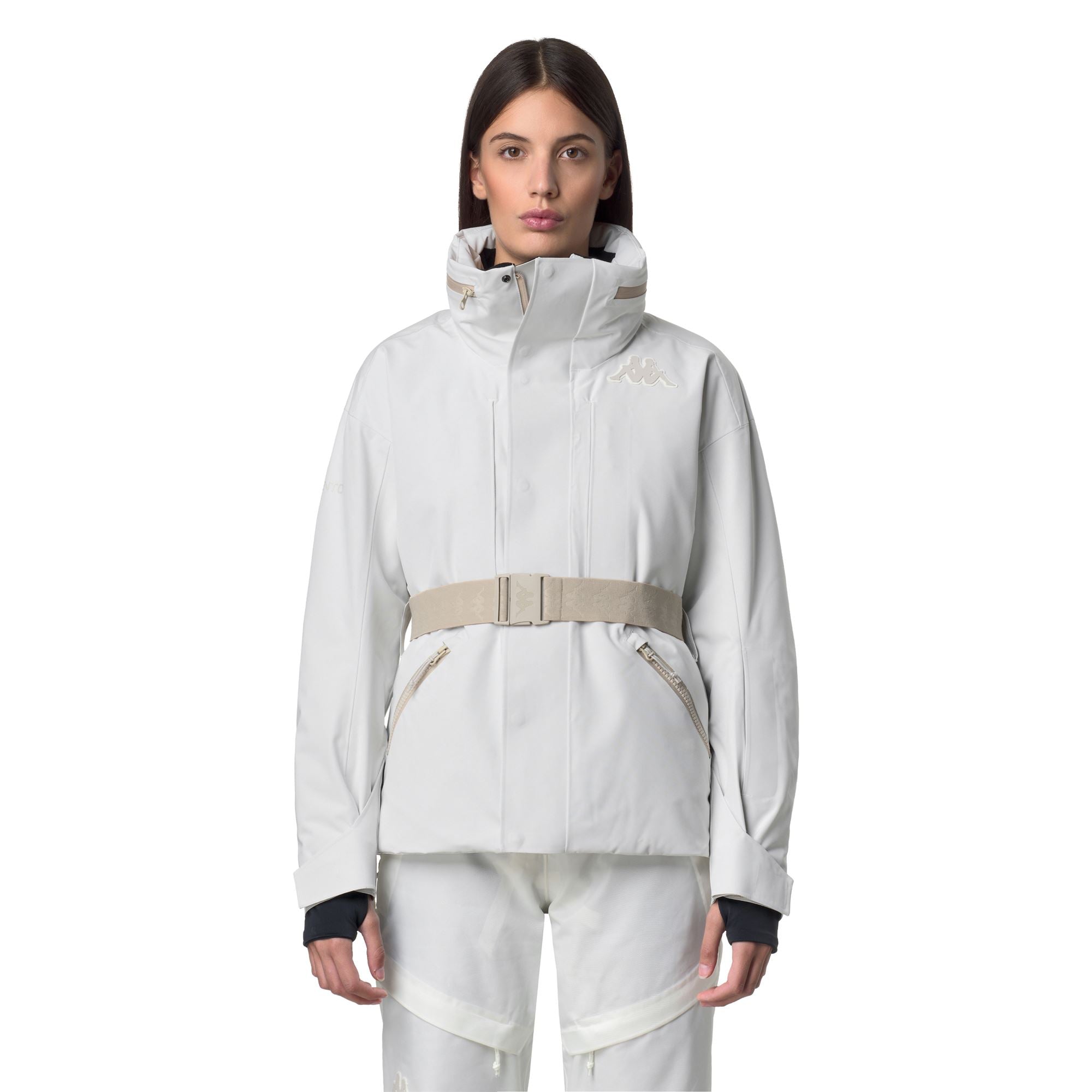 Slim fit ensures a close, feminine fit. Features include a concealable hood, chest pocket with flap and zip, waterproof zip side pockets, elastic waist belt, ventilation zips, internal snow gaiter, elastic cuffs, taped seams, and customizable adjustments. The design is completed with the applied 6CENTO logo and applied Omini logo.