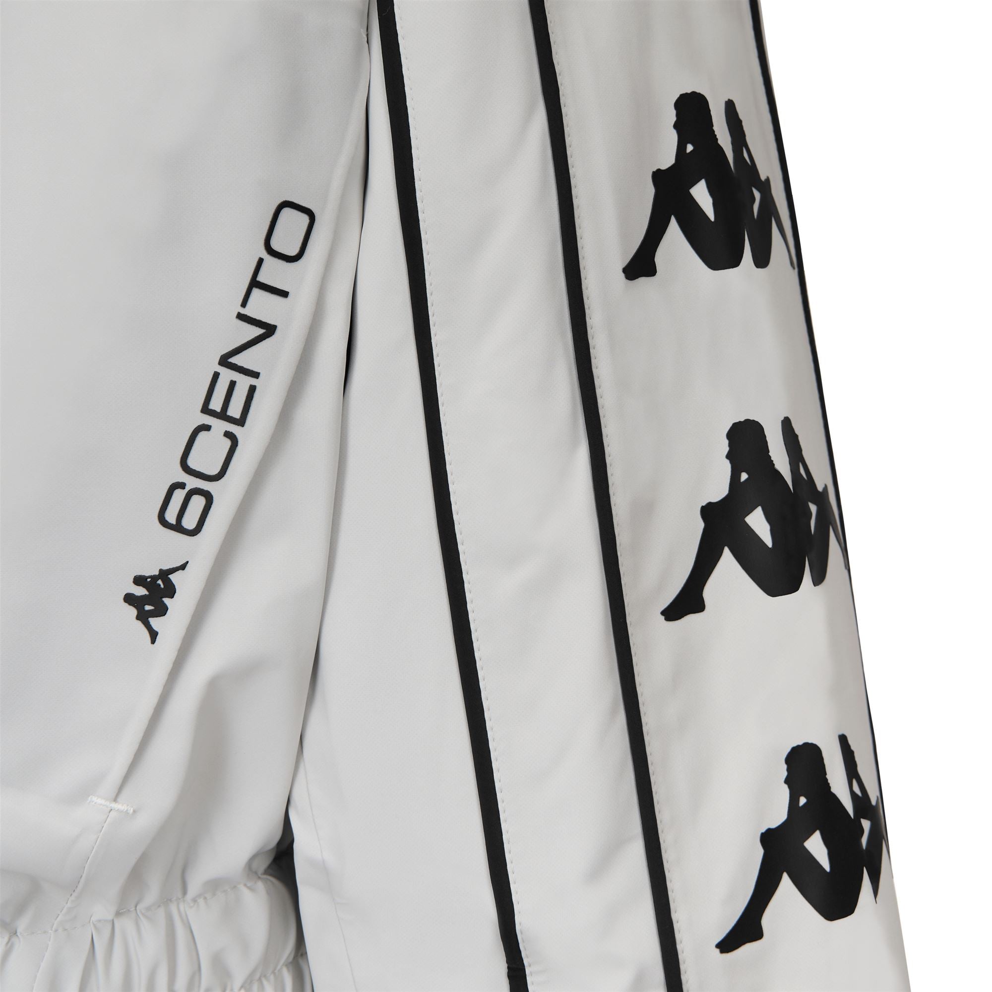 Features include 222 Band on the shoulders and hem with elastic, detachable hood, chest pocket, side pockets, flap pockets with zip closure, ventilation zips, elastic cuffs, taped seams, and customizable adjustments. Distinctive details include the applied 6CENTO logo and applied 222 Band Kappa.