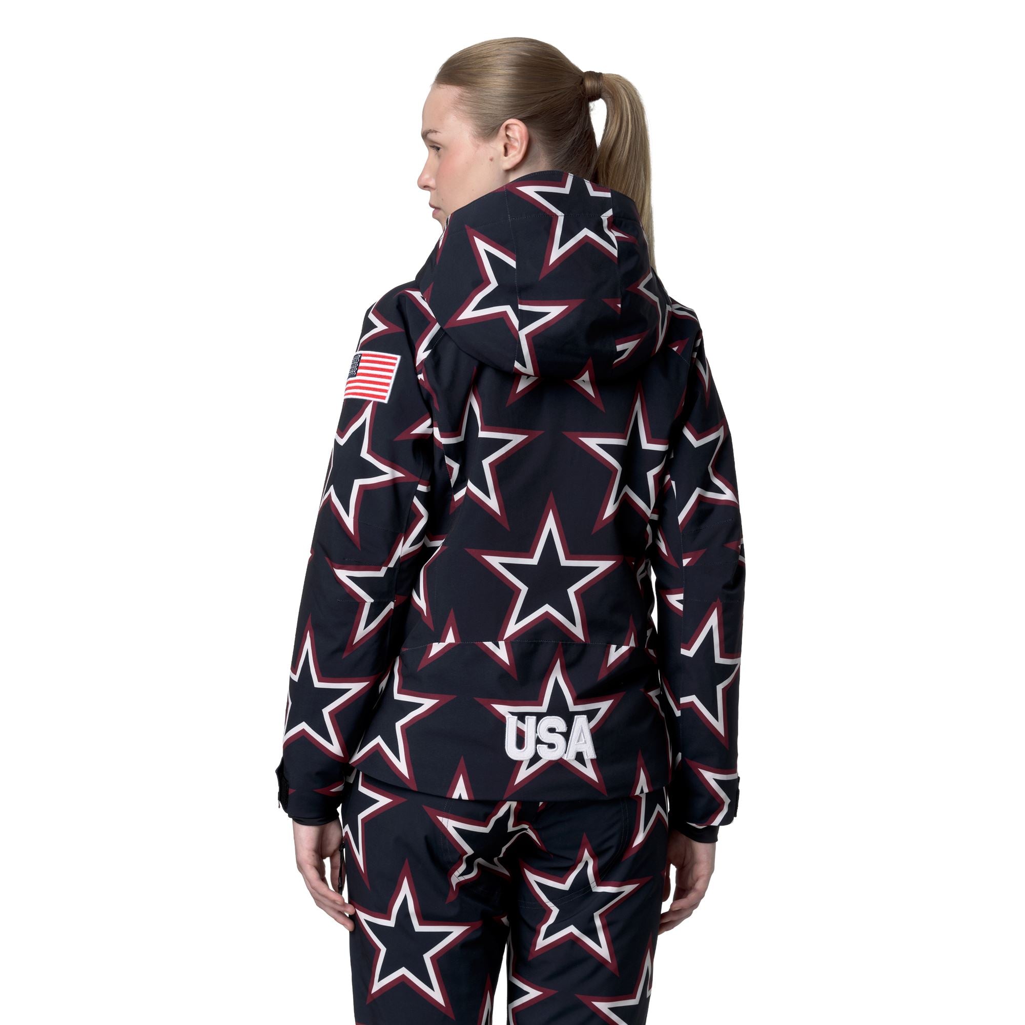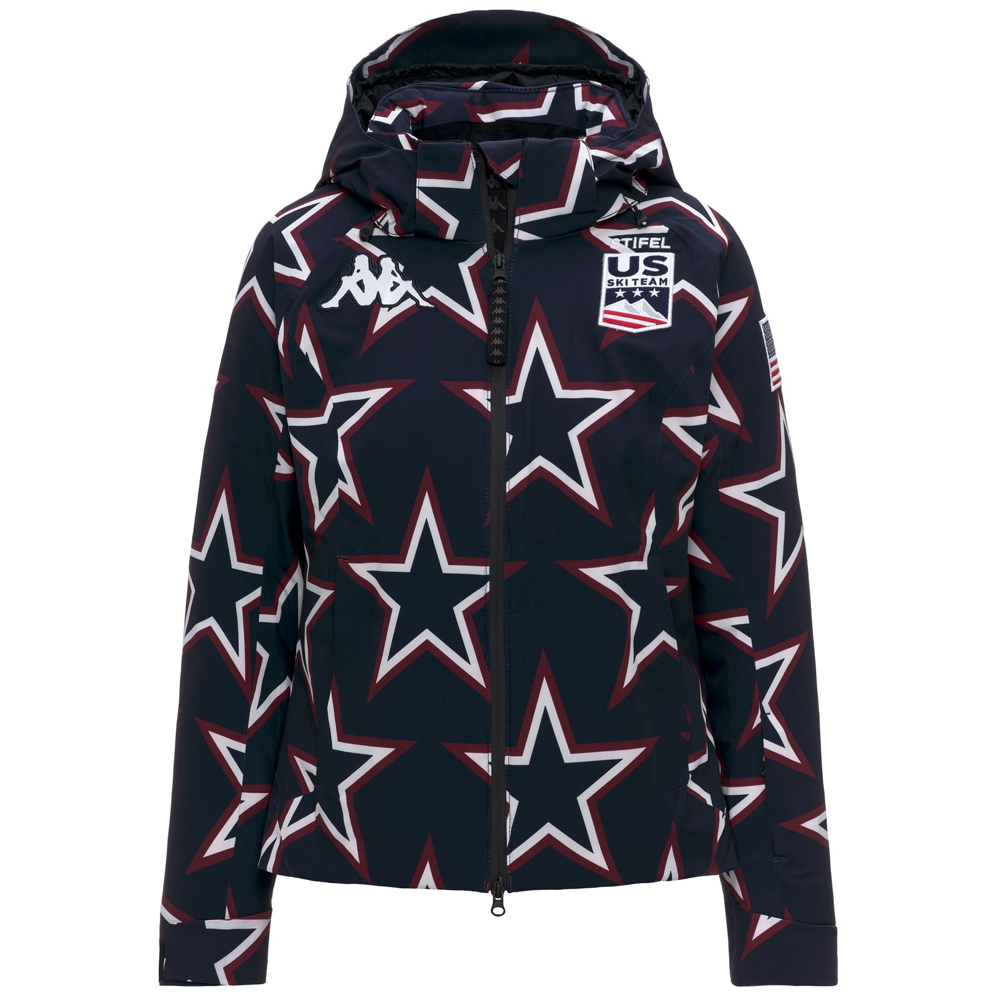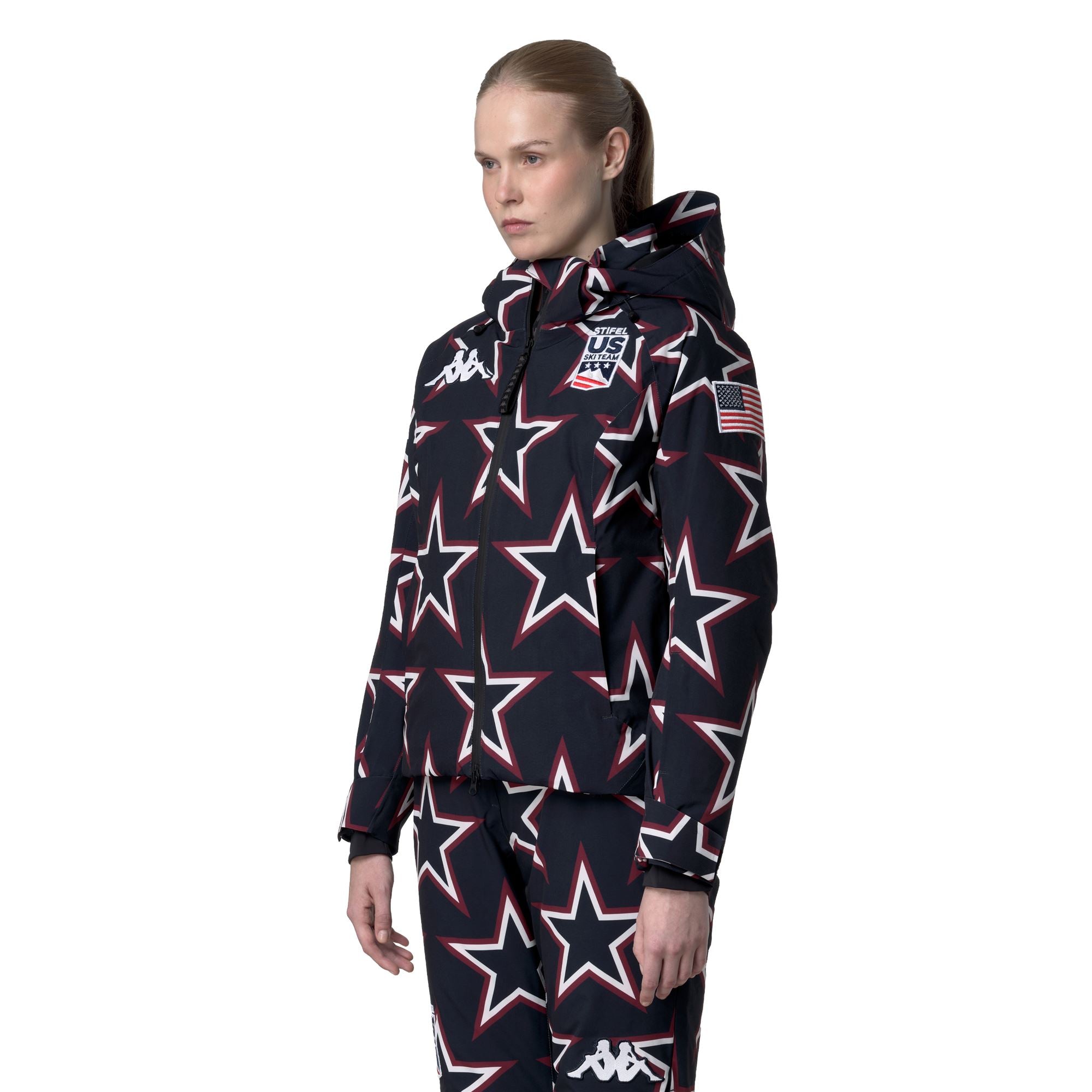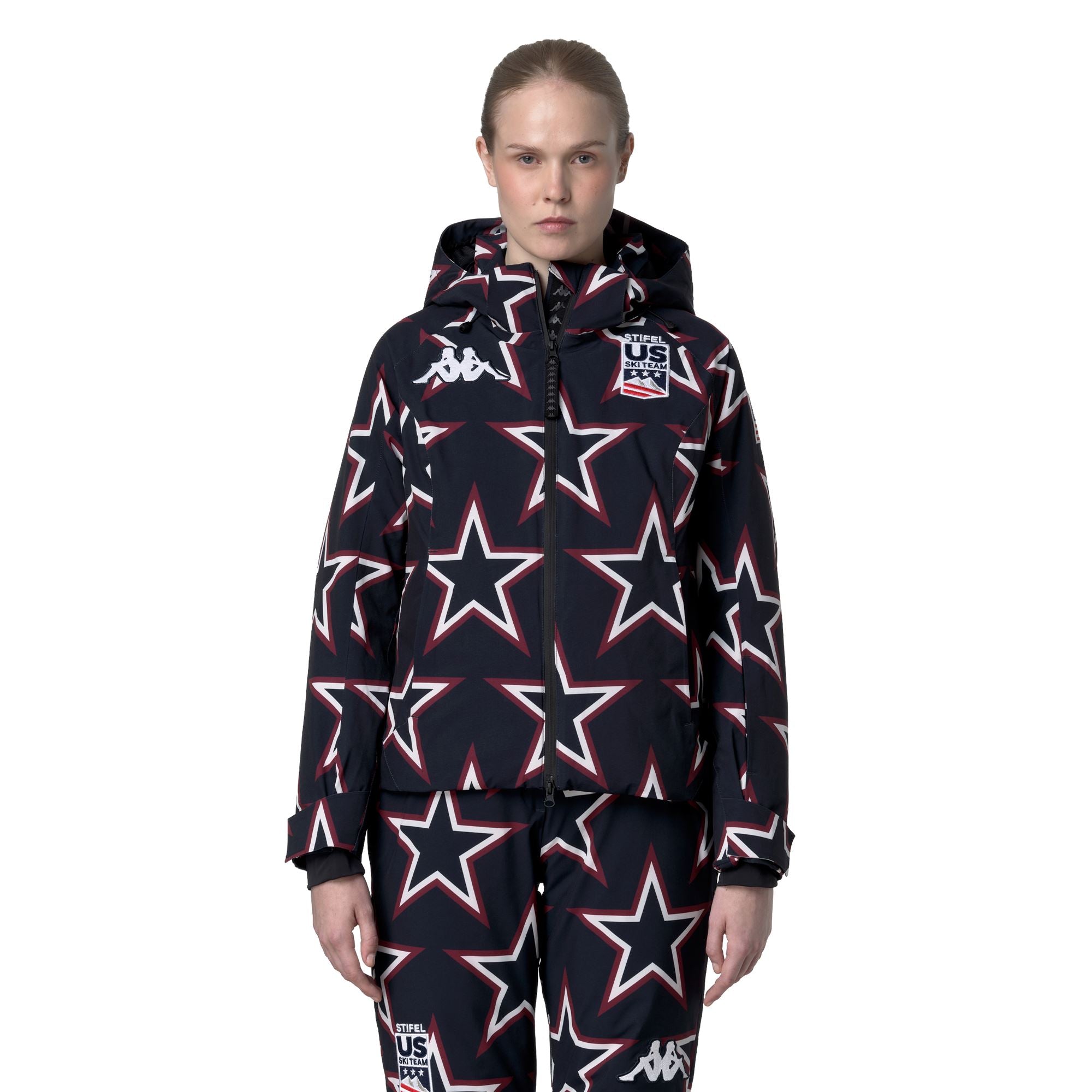 Features include a detachable hood, flap pockets with zip closure, ventilation zips, internal snow gaiter, elastic cuffs, taped seams, and customizable adjustments, combining protection, comfort, and practicality for the mountains and winter sports. Distinctive details include the Omini logo and US Ski and Snowboard Team customizations.
