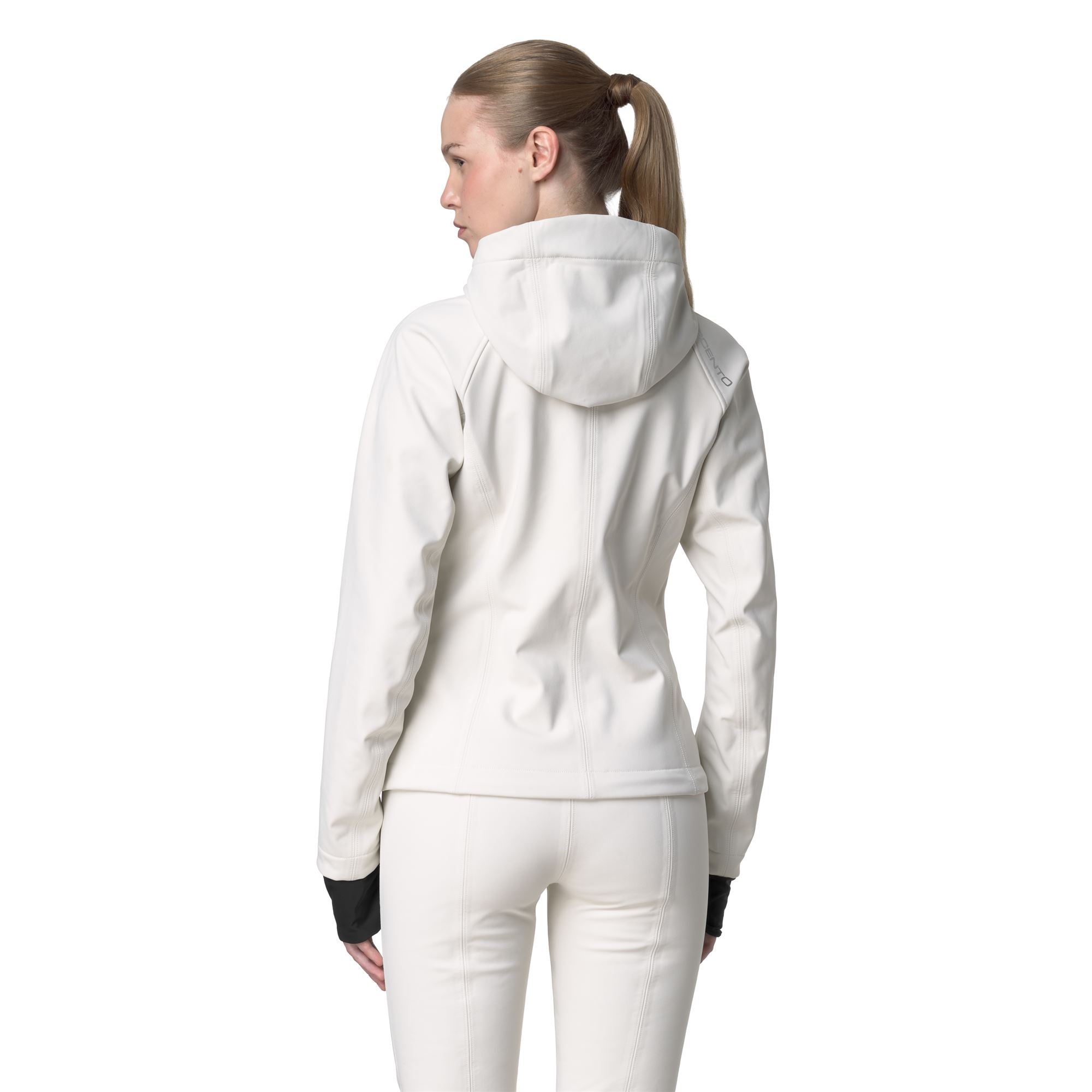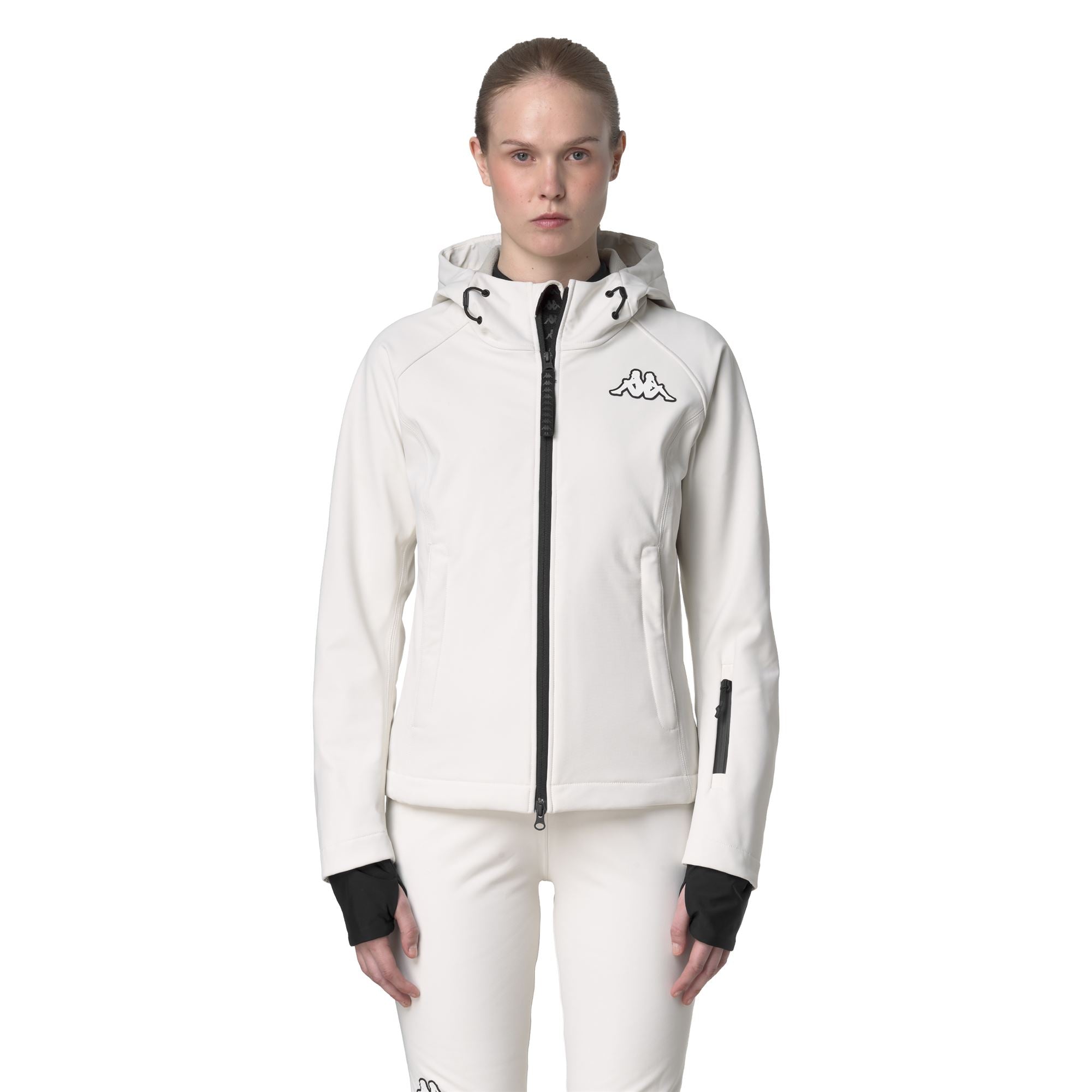 Women’s softshell jacket made from bonded fabric, featuring WATERPROOF PROTECTION 10,000 mm H₂O, BREATHABILITY 10,000 g/m²/24h, and PFC-free water-repellent treatment for protection and comfort in all weather conditions.