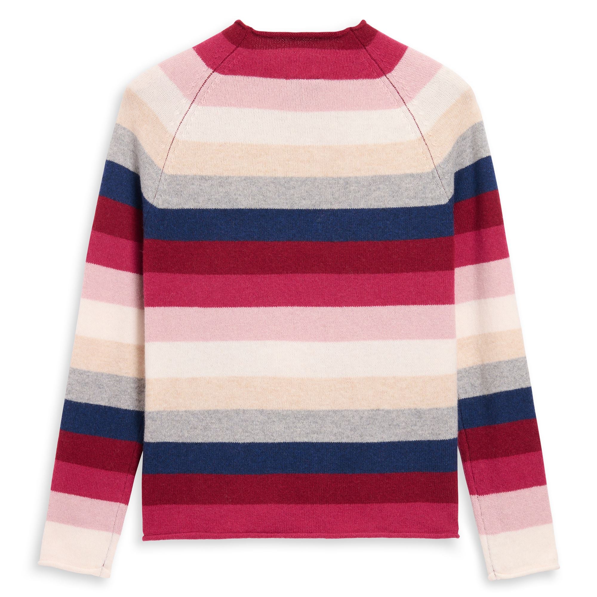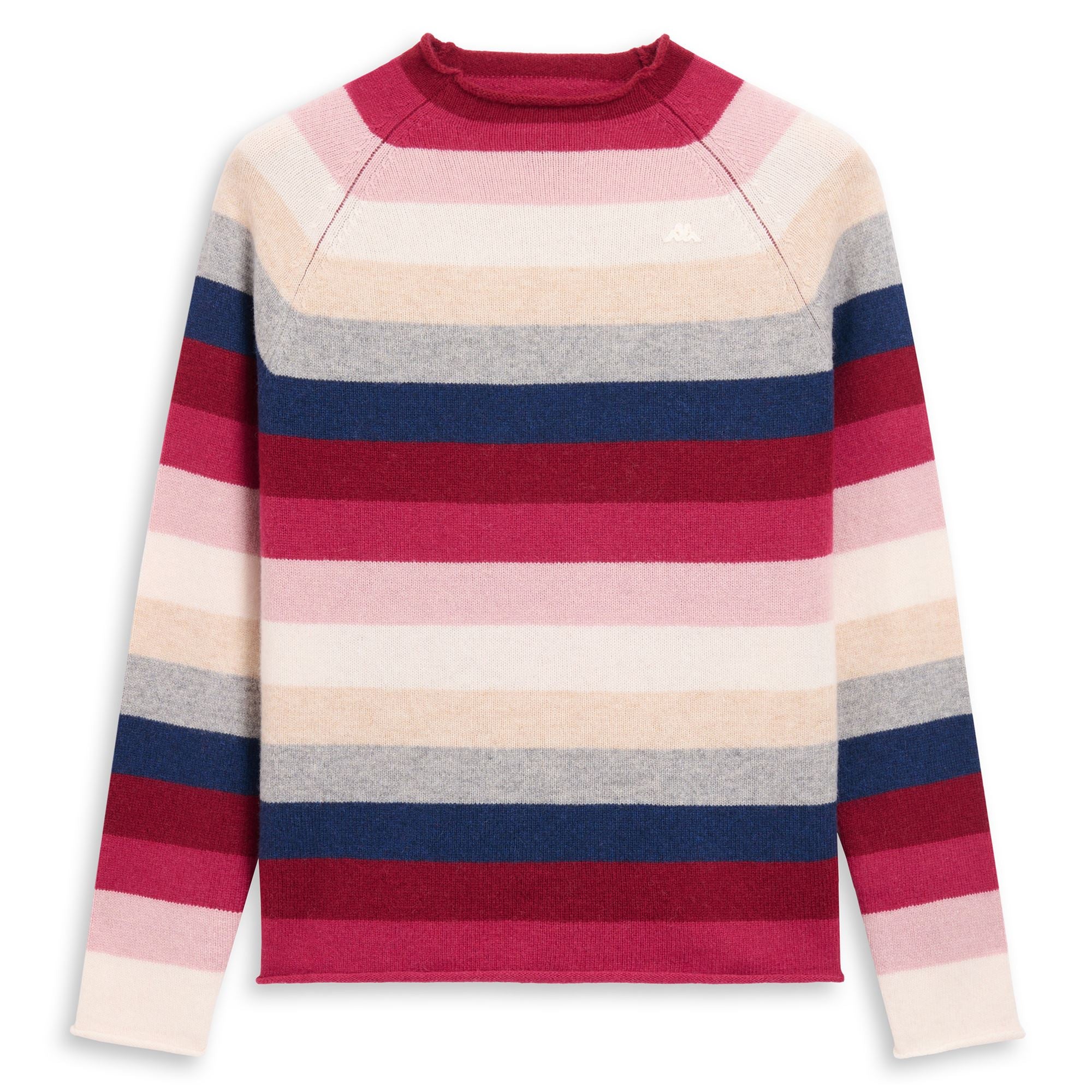 CLASSICO. Roundneck woman pullover in lambswool. CLASSIC FIT. Multicolor striped knit. Omini patch on sleeve.