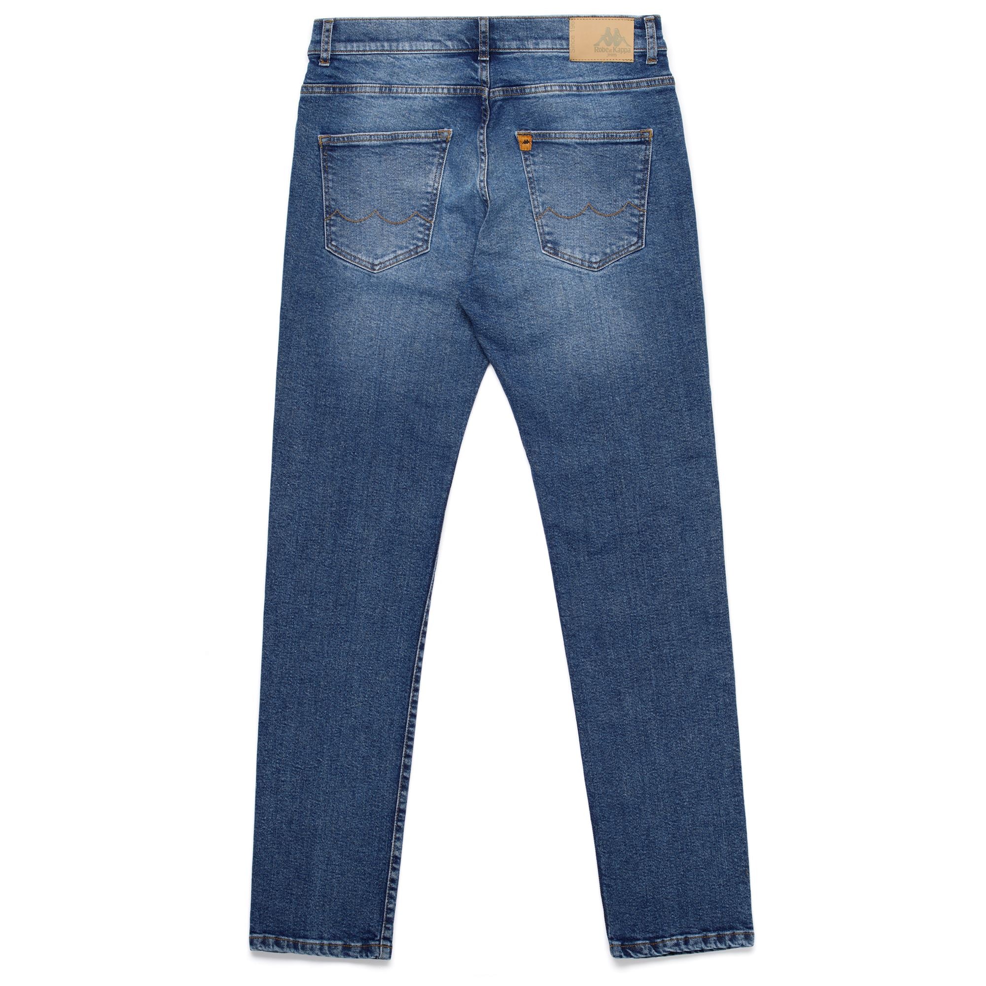 RDK JEANS. 5 pockets for men in denim. REGULAR FIT. Personalized buttons and rivets. Omini Logo flag on the 4th pocket, personalized pocket chain stitchings, back patch in synthetic leather with Logo Robe di Kappa Jeans printed.