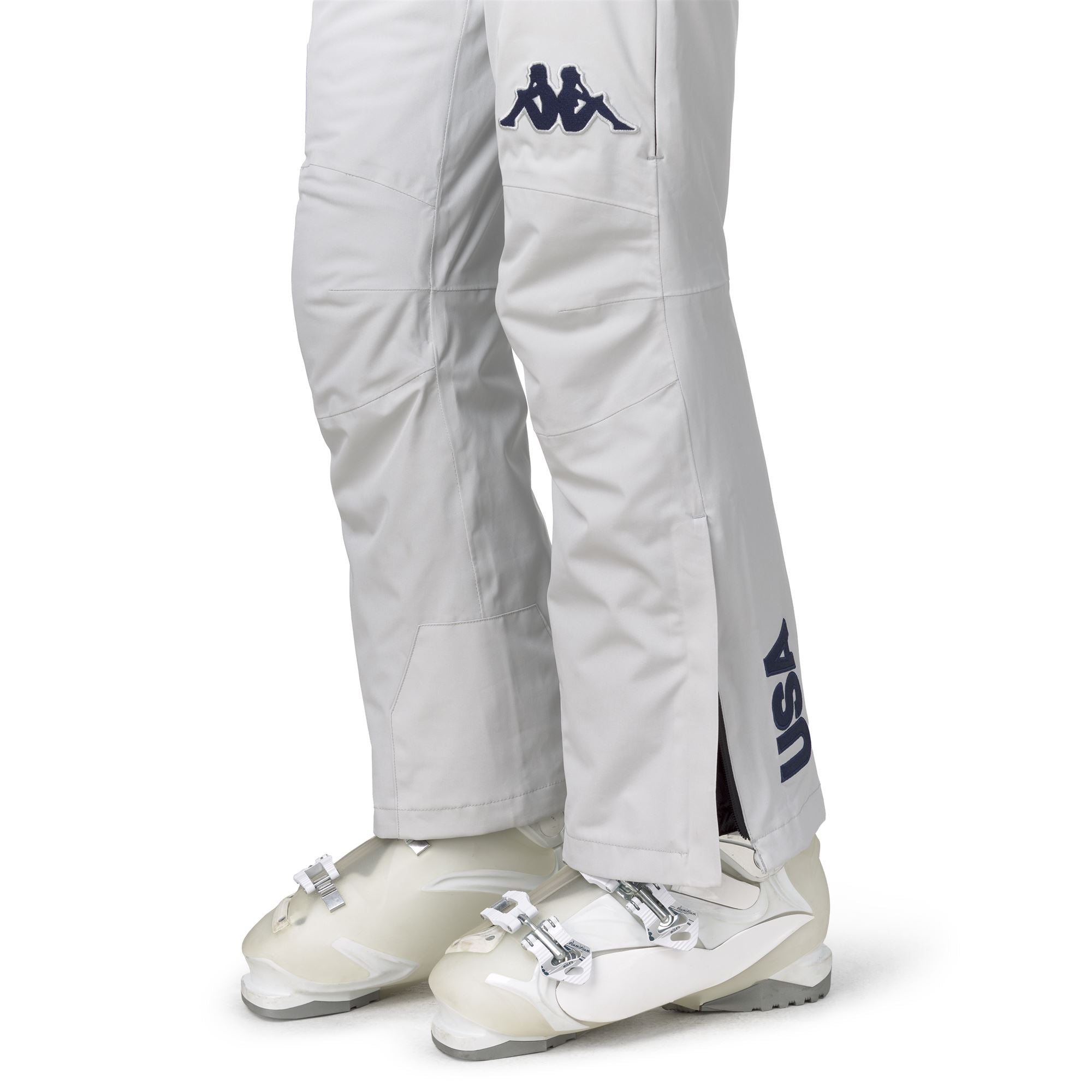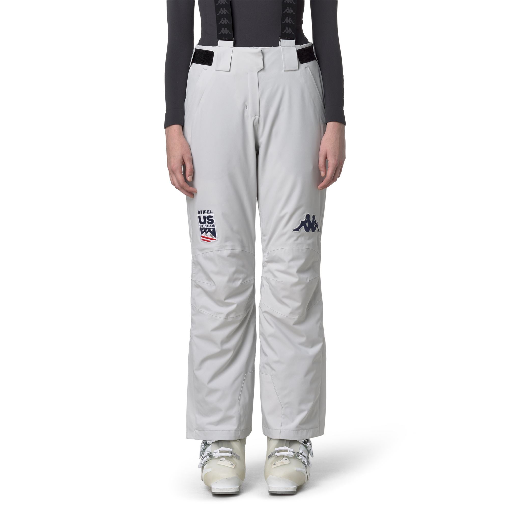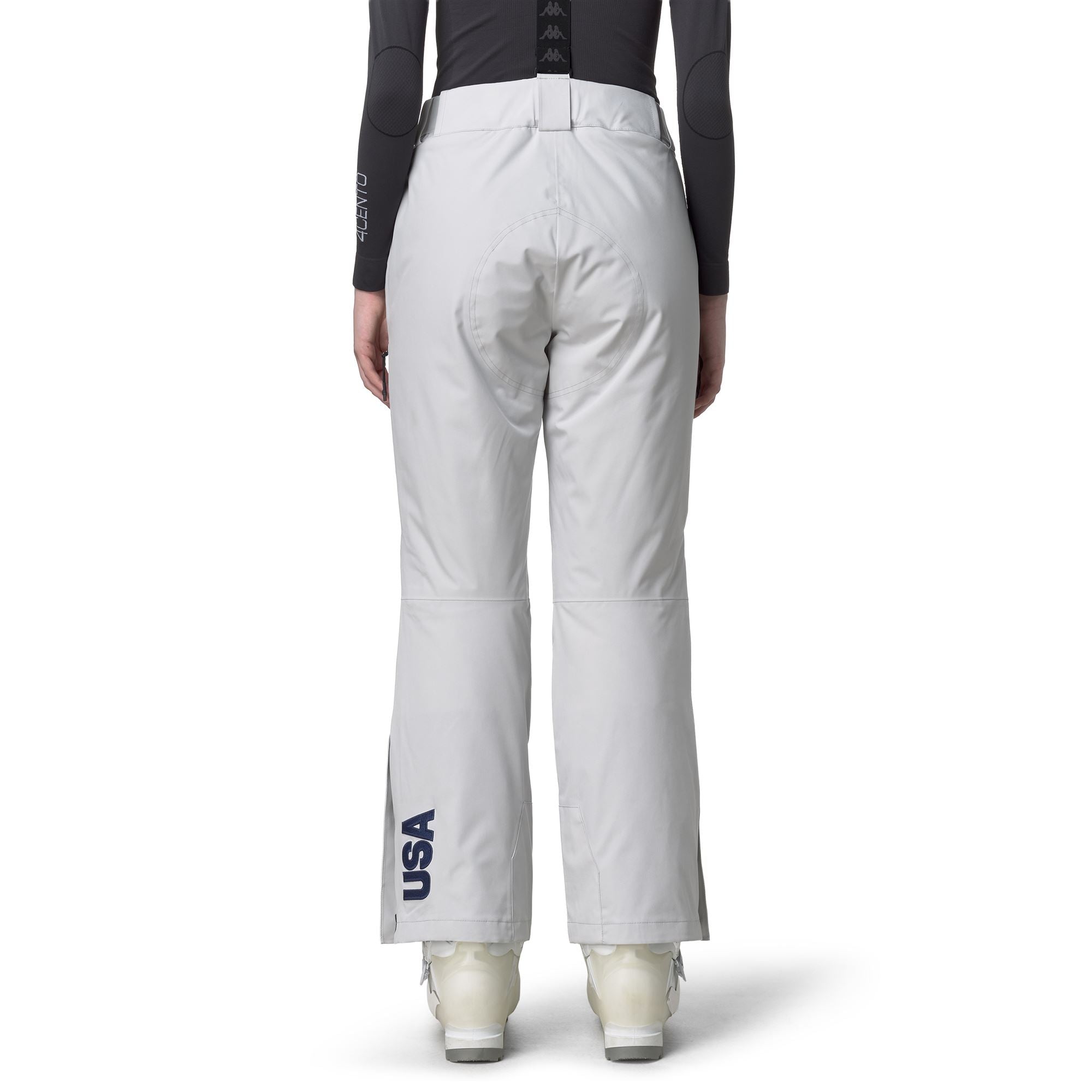 GARA. Woman padded in 2 layers stretch fabric with WATERPROOF PROTECTION 10000 mm H2O, BREATHABILITY 10000 g/m²/24h, with water repellent treatment PFC-Free, padding 60gr. SLIM FIT. Detachable braces with Banda tape with logo Omini personalization, adjustable waist, pockets with waterproof zip clousure, bottom leg zip opening, bottom leg reinforced, boots gaiters, ventilation opening, heat sealed seams. Logo Omini embroidered. US SKI & SNOWBOARD.
