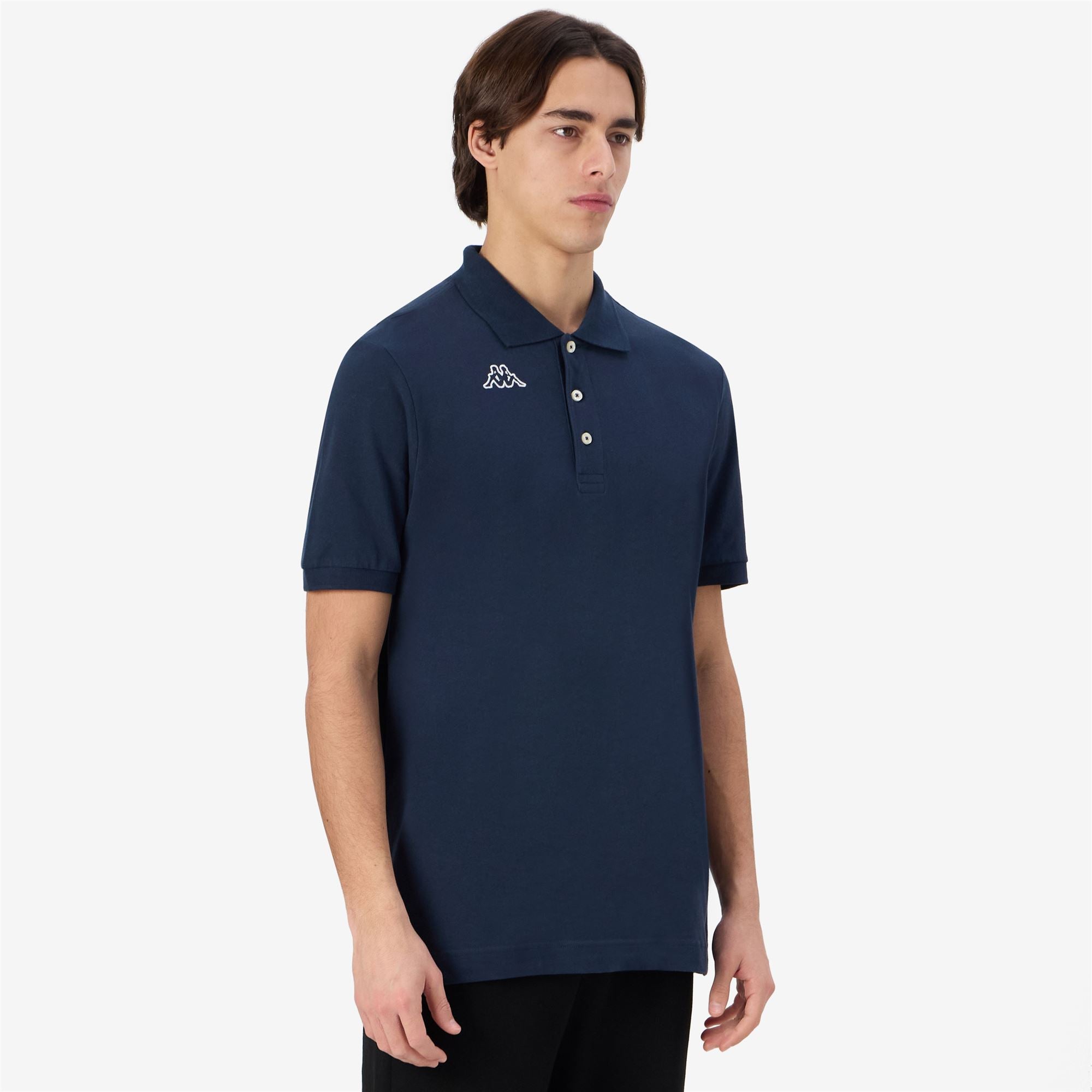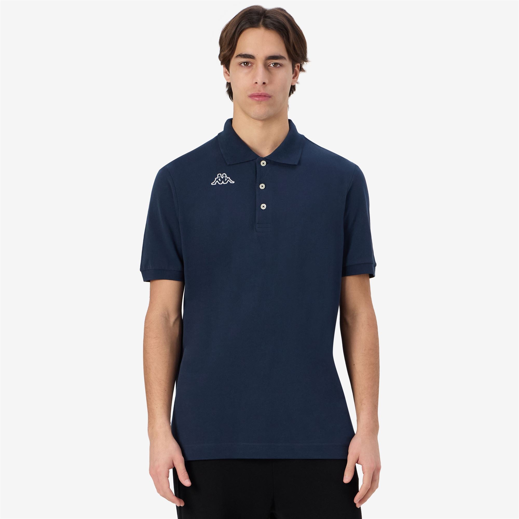 LOGO. Polo man in cotton piquet fabric. REGULAR FIT. Short sleeves, 3 personalized buttons. Flat knit rib collar and borders. Omini logo outline embroidered on chest. Kappa lettering printed on collar.