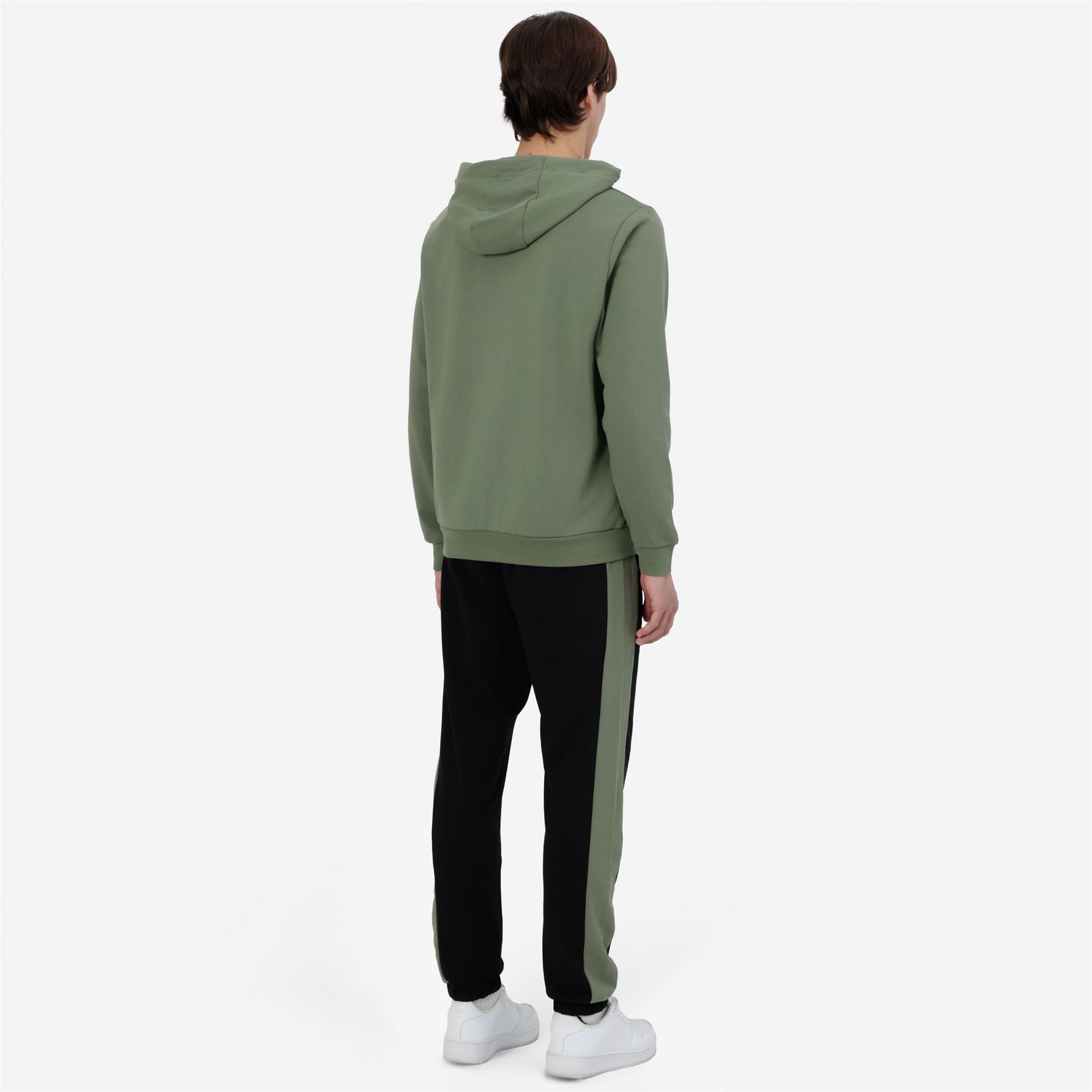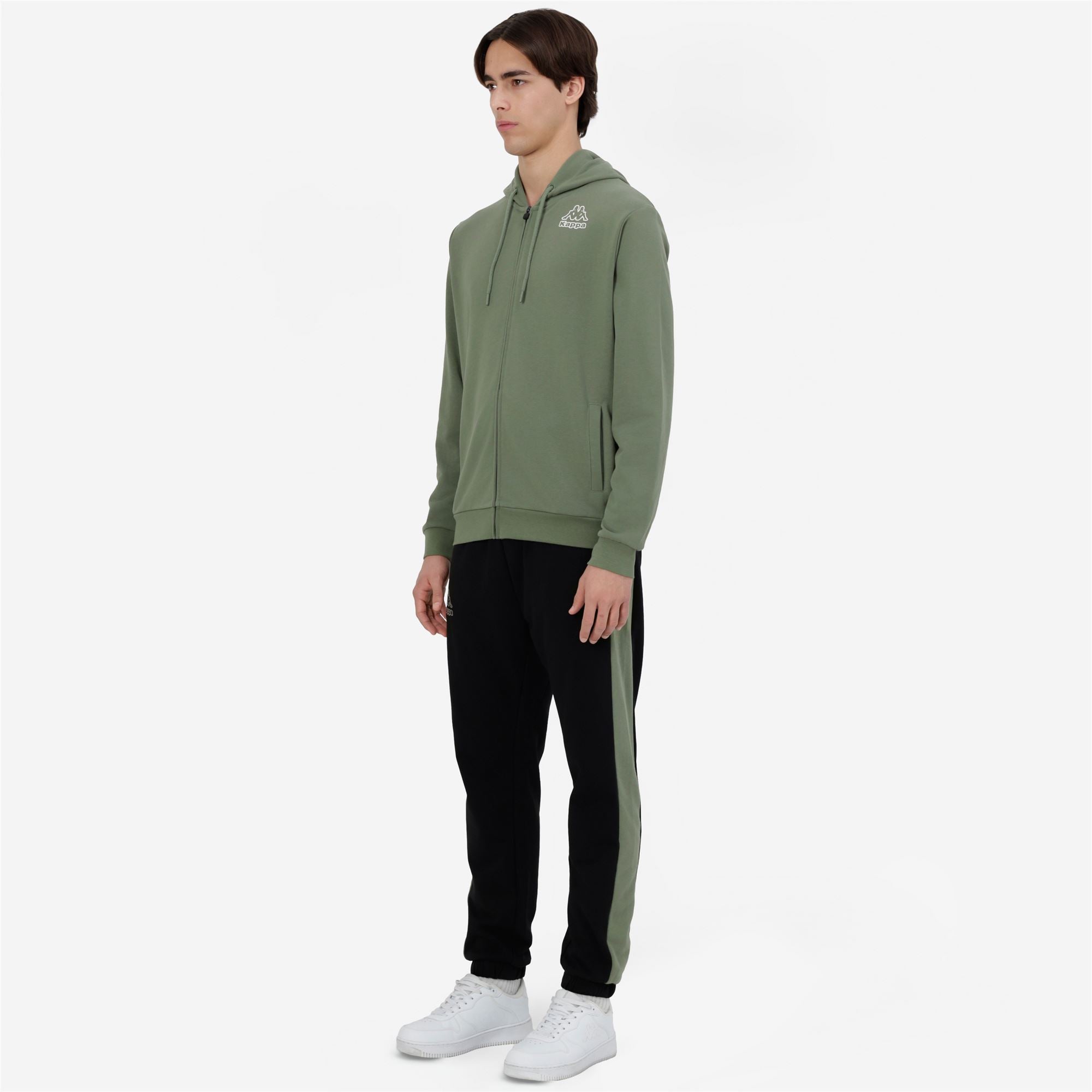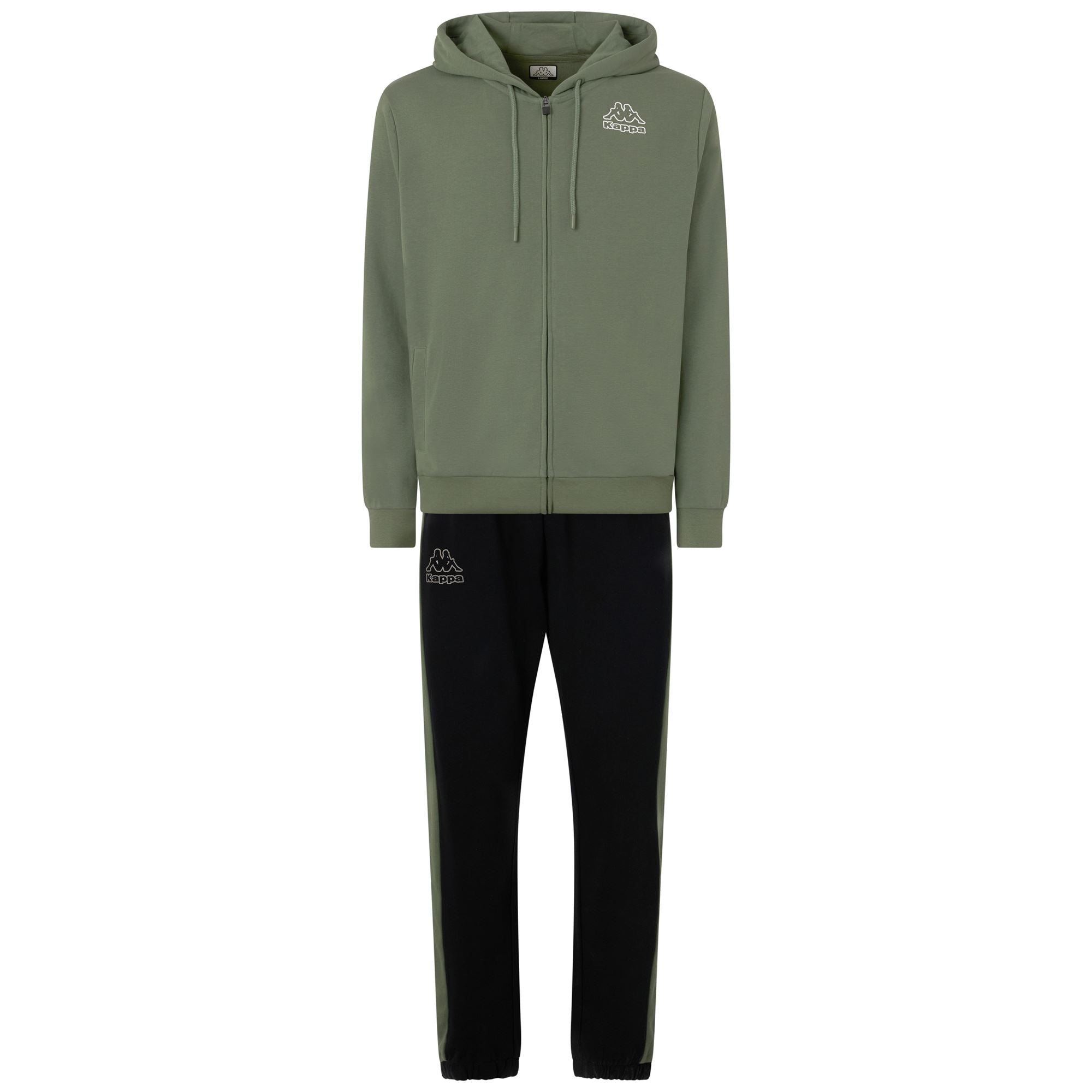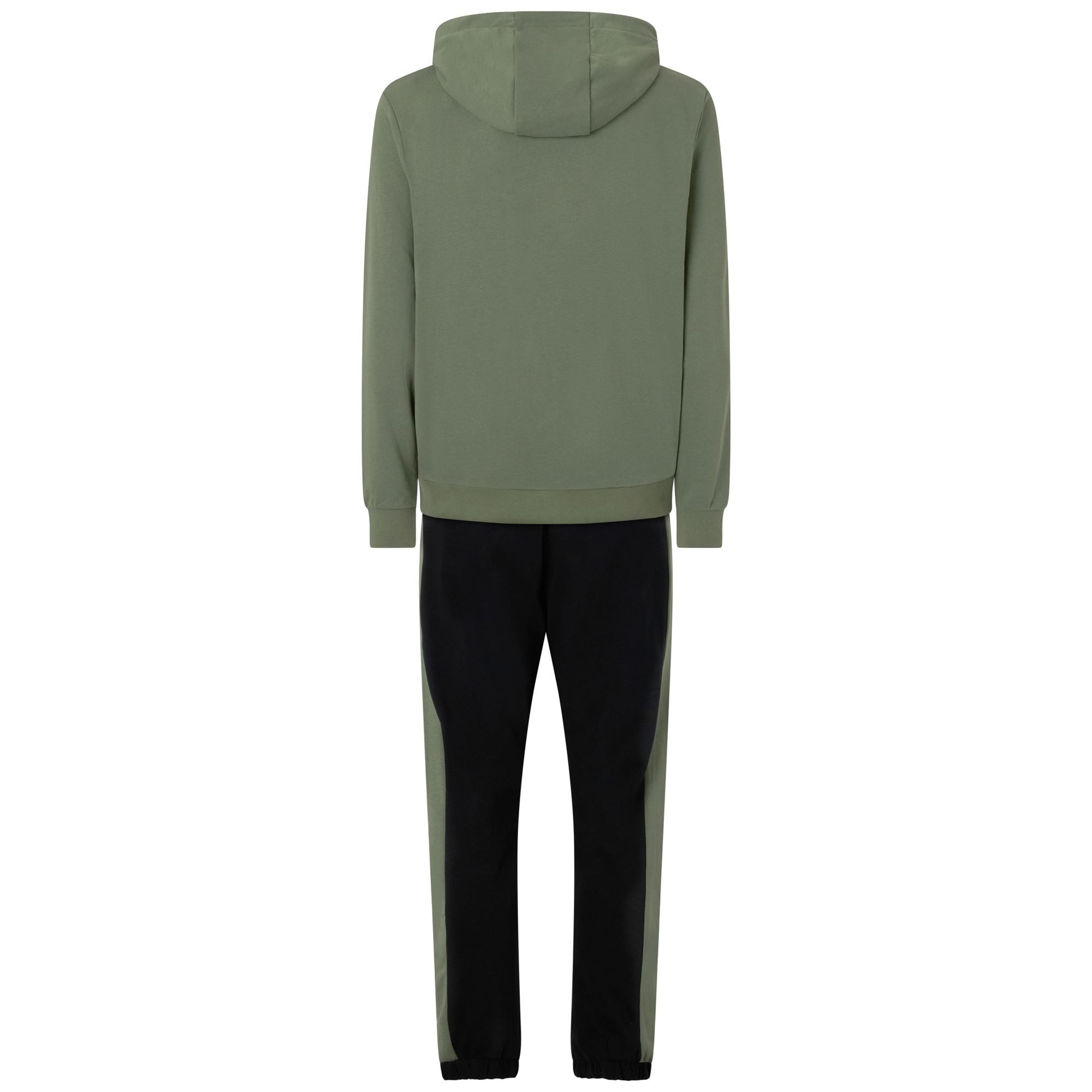 Hooded fleece with zip, welt pockets, and rib cuffs and pants with side inserts and elasticated bottom.